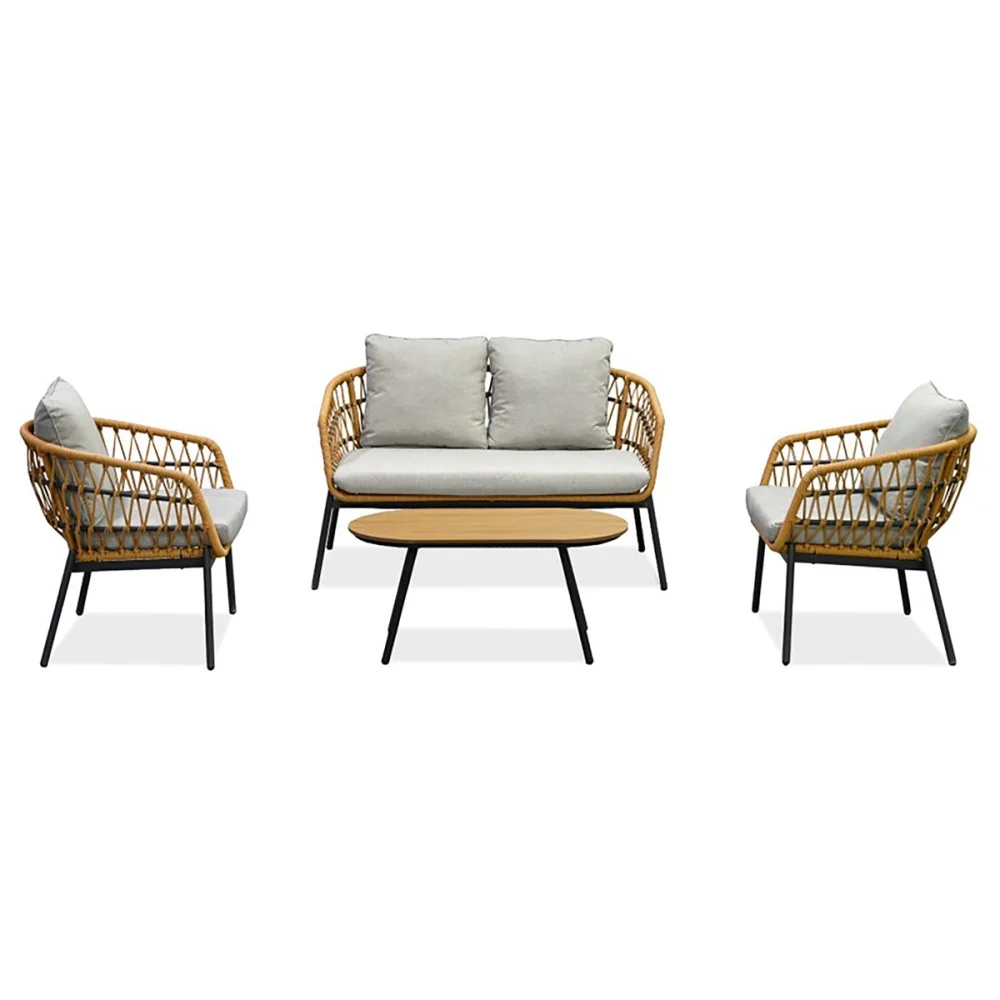 Ideální zahradní souprava pro terasy a zahrady, která spojuje pohodlí s moderním vzhledem. Je vyrobena z odolného polyratanu v přírodním odstínu, který dodává nábytku svěží a nadčasový vzhled.