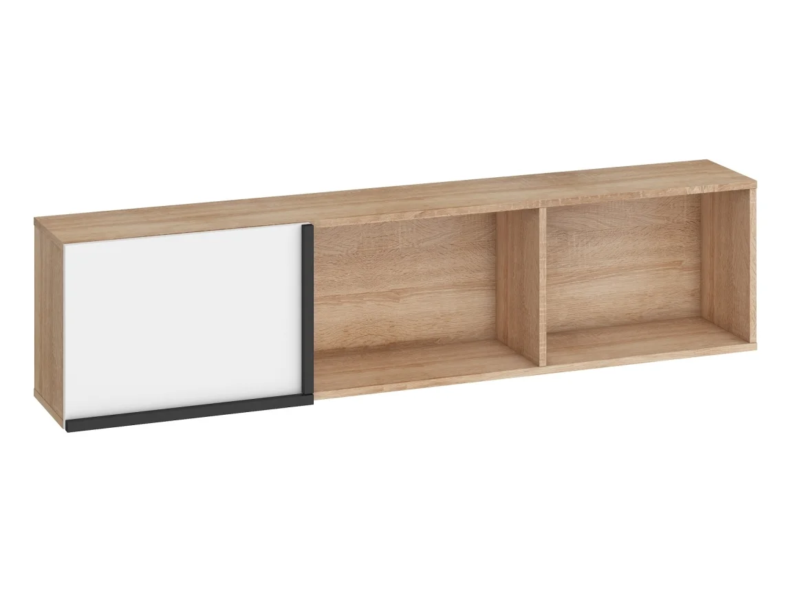 Praktická závěsná skříňka s jedněmi dvířky představuje ideální úložný prostor do obývacího pokoje nebo chodby. Provedení v dubu sonoma s bílým čelem a černými lištami vytváří moderní kontrast, který se hodí k mnoha zařizovacím stylům.