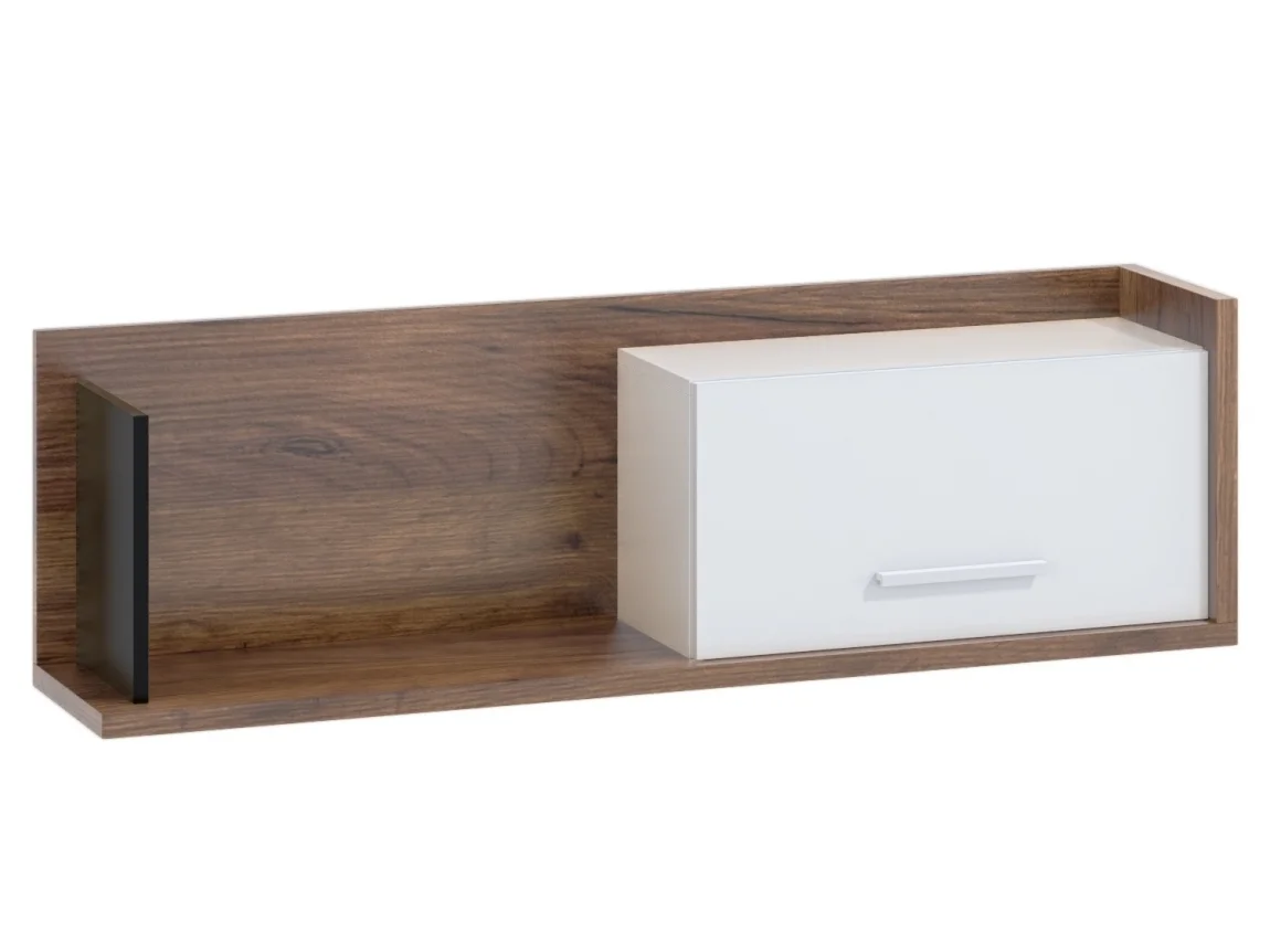 Závěsná police KNUT 1D s dvířky v kombinaci barev craft tobaco, bílá a černá skvěle doplní moderní interiéry. Rozměry 125 × 37 × 27 cm vycházejí z konstrukce z lamina o tloušťce 16 a 25 mm a jsou doplněny ABS hranami pro odolnost proti poškození.