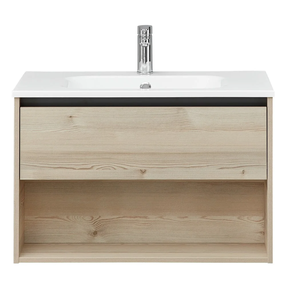 Elegantní závěsná skříňka v přírodním dekoru borovice s rozměry 51x80 cm, ideální pro moderní koupelny. Snadná instalace umožňuje umístění nábytkového umyvadla nebo varianty s deskou na přikoupení, čímž si přizpůsobíte vzhled podle svých potřeb.