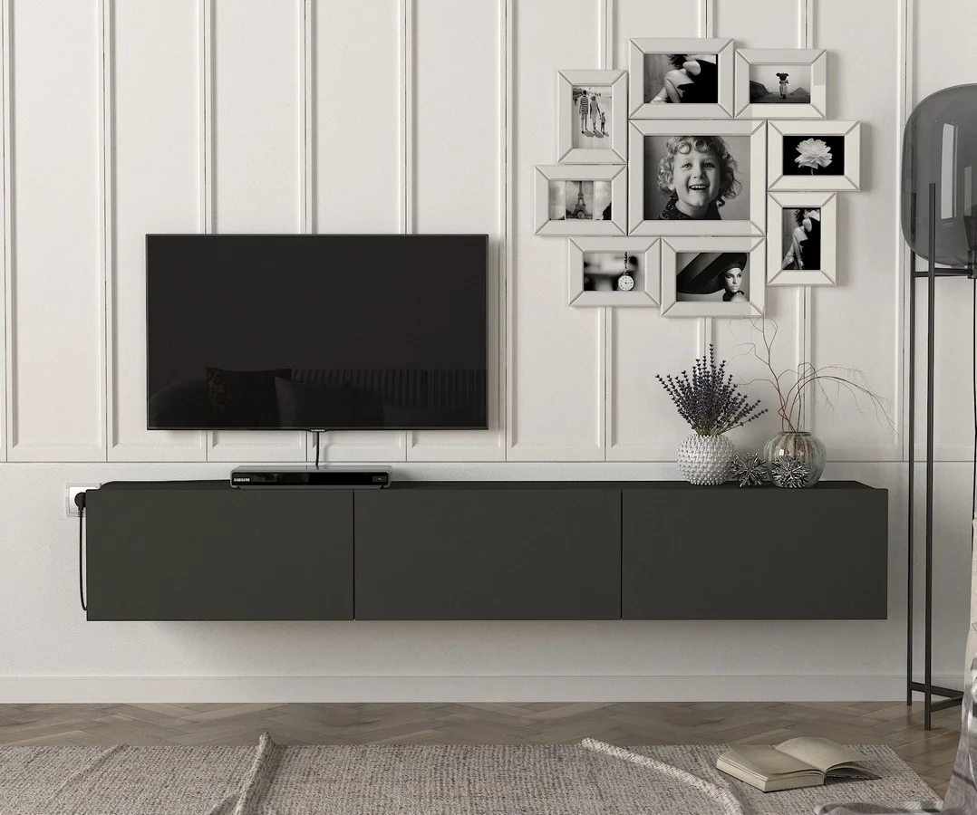 Osvěžte obývací prostor praktickým závěsným televizním stolkem s třemi výklopnými dvířky, který nabízí dostatek úložného prostoru a čistý, moderní vzhled. Je vyroben z odolného lamina tloušťky 18 mm s PVC hranou, díky čemuž je povrch odolný proti poškození a snadný na údržbu. Barva provedení tmavě šedé antracit působí nadčasově a hodí se ke většině interiérů. Rozměry (š x v x h): 160 × 49,8 × 46,1 cm. Materiál: LTD lamino. Dodáváno v demontu.