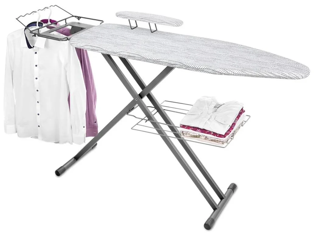 Přidanou výhodou je prostorná odkládací plocha s žáruvzdornými silikonovými podložkami na žehličku a věšák pro zavěšení vyžehlených oděvů, stejně jako odkládací mřížka na vyžehlené prádlo.