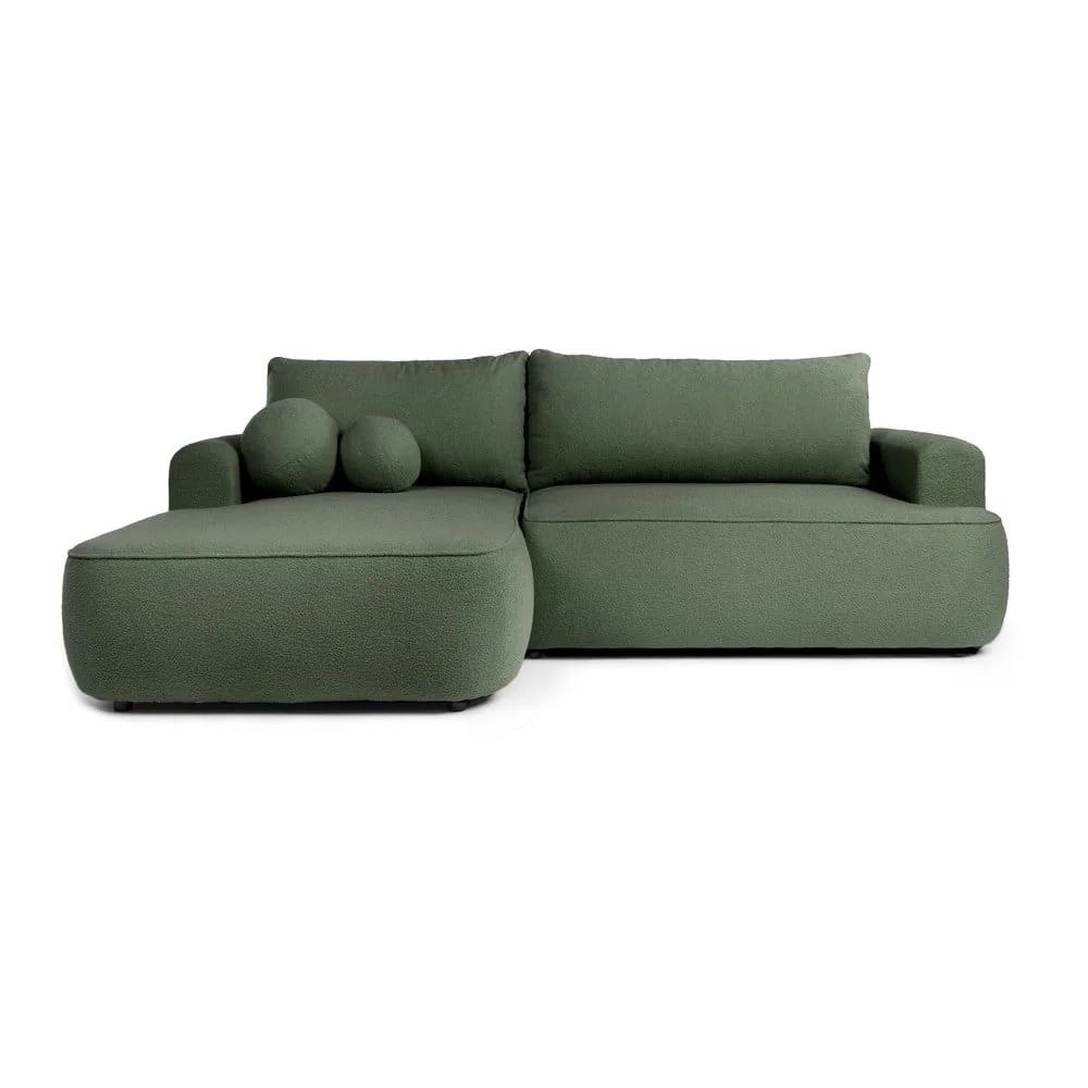 Elegantní a praktická rohová pohovka v zelené barvě, která je vhodná pro každý moderní interiér, nabízí nejen stylový vzhled, ale i vysoké pohodlí díky měkkému potahu z tkaniny bouclé.