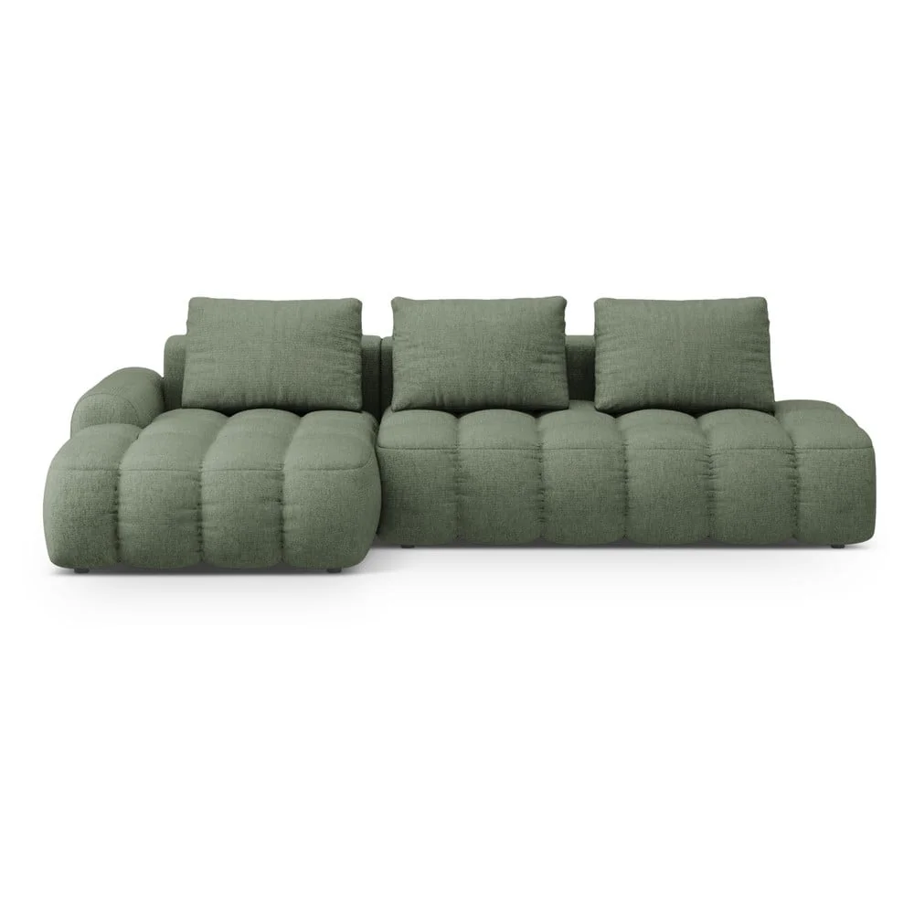 Tato zelená rohová pohovka s možností rozložení je ideálním řešením pro moderní obývací pokoj. Díky integrovanému úložnému prostoru vám umožní efektivně uskladnit polštáře, deky nebo jiné drobnosti, čímž pomáhá udržet pořádek. Pohovka s levým rohem a lenoškou nabízí nejen komfort, ale také praktické využití místa, což ocení každý, kdo hledá multifunkční nábytek v elegantním designu. Navíc její moderní vzhled z kolekce Cosmopolitan Design dodá vašemu interiéru svěží a stylový nádech.