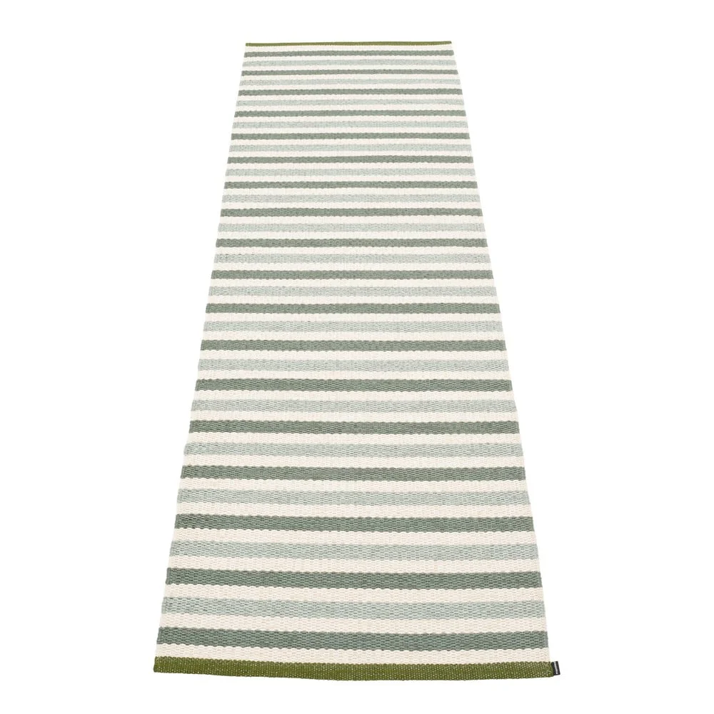 Elegantní běhoun Teo Sage v rozměrech 70x240 cm přináší do vašeho prostoru svěží pruhovaný vzor, který spojuje moderní design s tradiční švédskou kvalitou. Díky svému nadčasovému vzhledu je vhodný jak do interiéru, tak i na venkovní terasy či balkóny, čímž rozšiřuje možnosti jeho využití. Vyrobený z bezpečného PVC bez ftalátů, je odolný vůči povětrnostním vlivům a velmi snadno se udržuje, neboť jej lze čistit ručně nebo v pračce na 30 °C.