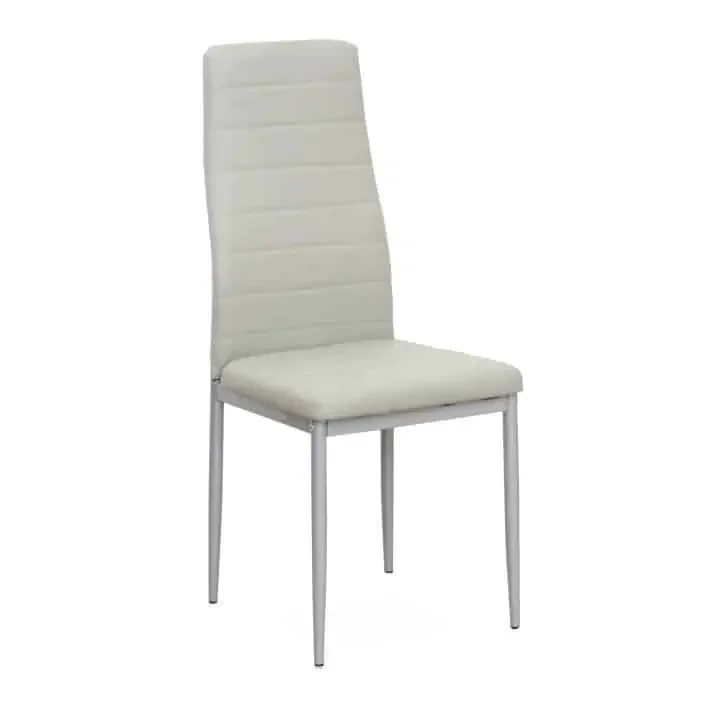 Moderní jídelní židle s čistými liniemi dodá jídelnímu prostoru lehký a elegantní vzhled. Nohy židle jsou vyrobené z kovu a mají stříbrnou barvu, která ladí s moderním interiérem. Sedák a opěrák jsou potaženy světlou šedou ekokůží, která zajišťuje příjemný dotyk a snadnou údržbu. Židle se dodává v demontu, s možností montáže na místě dle potřeby. Kvůli jednoduché konstrukci je vhodná pro domácí interiéry a není určena do zatěžovaných prostor. Pro komfortní a stylový jídelní kout doporučujeme ji doplnit o vhodný stůl a doplňky; její světlá barva a elegantní tvar prostor opticky rozšíří. Snadná údržba a dlouhá životnost díky kvalitní ekokůži usnadní každodenní provoz v domácnosti a bez námahy ji udržíte čistou.