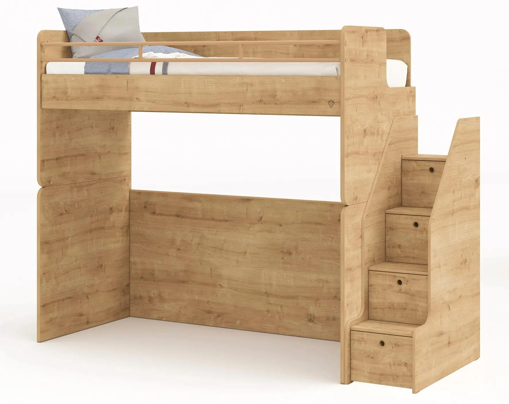 Horní lůžko s nosností až 130 kg je vybaveno pevnými dřevěnými rošty s větracími otvory a bezpečnostní zábranou, zatímco schody obsahují čtyři úložné boxy, které lze umístit na pravou či levou stranu podle dispozice místnosti. Postel je vhodná pro matraci o výšce 16 až 21 cm. V případě potřeby lze horní část přemístit na podlahu a využít jako samostatnou postel. Velkou výhodou je volný prostor pod postelí, který může sloužit jako herní zóna, relaxační koutek nebo místo pro psací stůl či šatní skříň. Variantně lze místo schodů zvolit žebřík, který umožňuje přístup z pravé či levé strany, čímž se zvyšuje přizpůsobivost nábytku vašim potřebám. Díky nadčasovému dekoru dubu se postel hodí do různých interiérů, od dětských pokojů přes studentské až po ubytovací zařízení. Pro ty, kdo preferují jiné odstíny, je dostupná i v elegantní bílé nebo modré verzi, například v kolekci Trio Studio. Tento multifunkční kus nábytku je ideální volbou pro efektivní a stylové zařizování dětského nebo studentského prostoru.